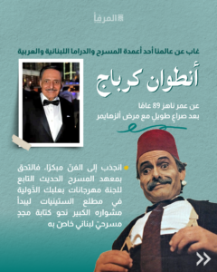 غاب عن عالمنا أحد أعمدة المسرح والدراما اللبنانية والعربية، “أنطوان كرباج” عن عمر ناهز 89 عامًا، بعد صراعٍ طويلٍ مع مرض ألزهايمر.